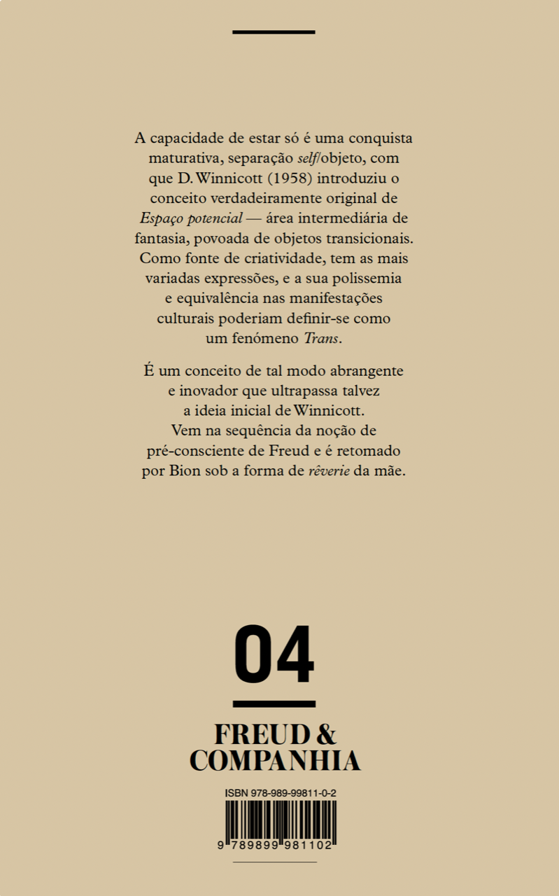 A capacidade de estar só é uma conquista maturativa, separação self/objeto, com que D.Winnicott (1958) introduziu o conceito verdadeiramente original de espaço potencial — área intermediária de fantasia, povoada de objetos transicionais. Como fonte de criatividade, tem as mais variadas expressões, e a sua polissemia e equivalência nas manifestações culturais poderiam definir-se como um fenómeno Trans. Como Espaço transicional que é, faz e mantém ativa a fronteira entre Espaço Interno/Realidade, entre Imaginário/Simbólico, entre Eu/não-Eu, entre Eu/Outro. É um conceito de tal modo abrangente e inovador que ultrapassa talvez a ideia inicial de Winnicott. Vem na sequência da noção de pré-consciente de Freud e é retomado por Bion sob a forma de rêverie da mãe.