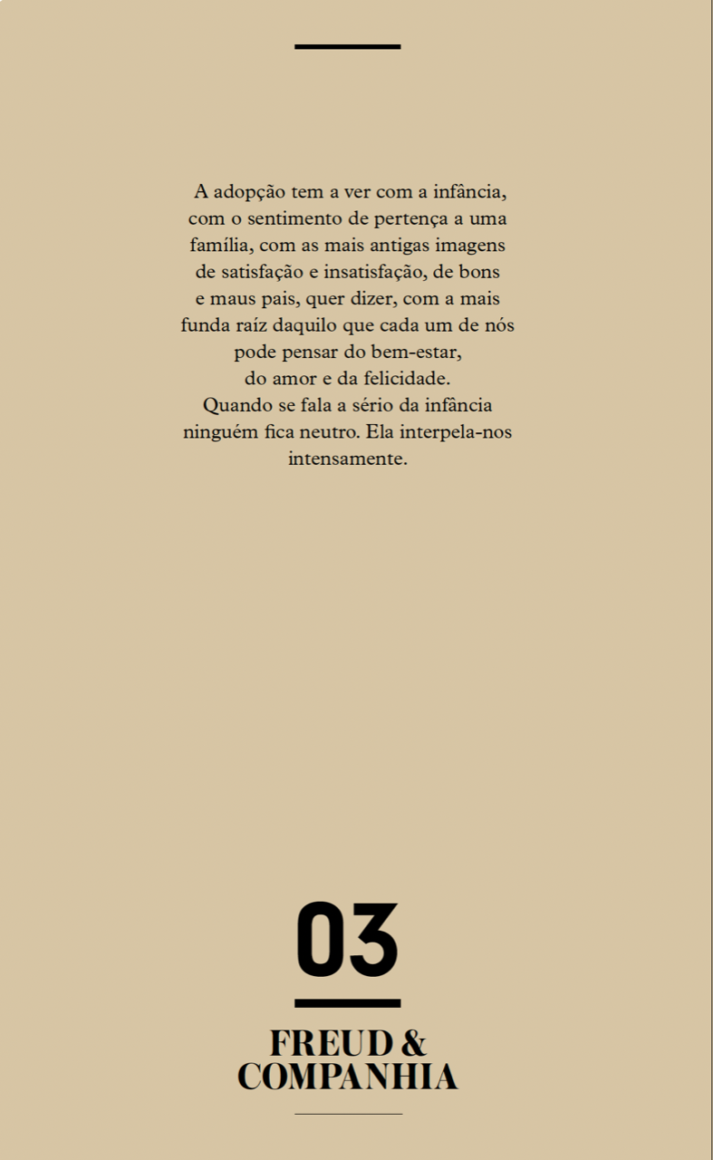 A adopção tem a ver com a infância, com o sentimento de pertença a uma família, com as mais antigas imagens de satisfação e insatisfação, de bons e maus pais, quer dizer, com a mais funda raiz daquilo que cada um de nós pode pensar do bem-estar, do amor e da felicidade. Quando se fala a sério da infância ninguém fica neutro. Ela interpela-nos intensamente.